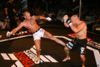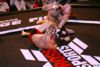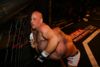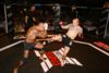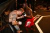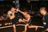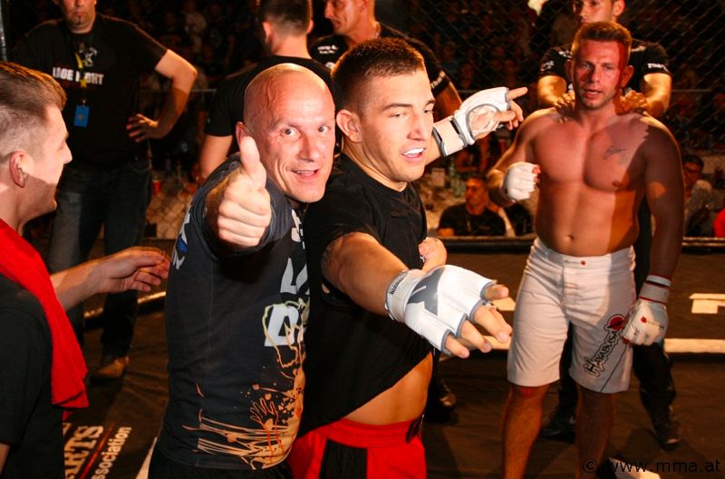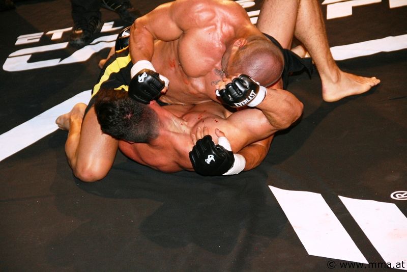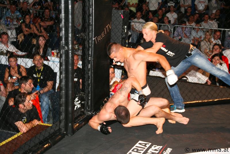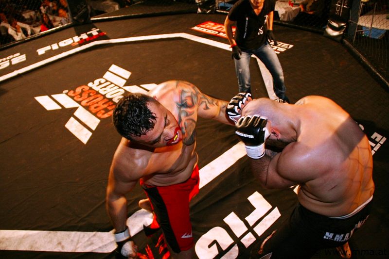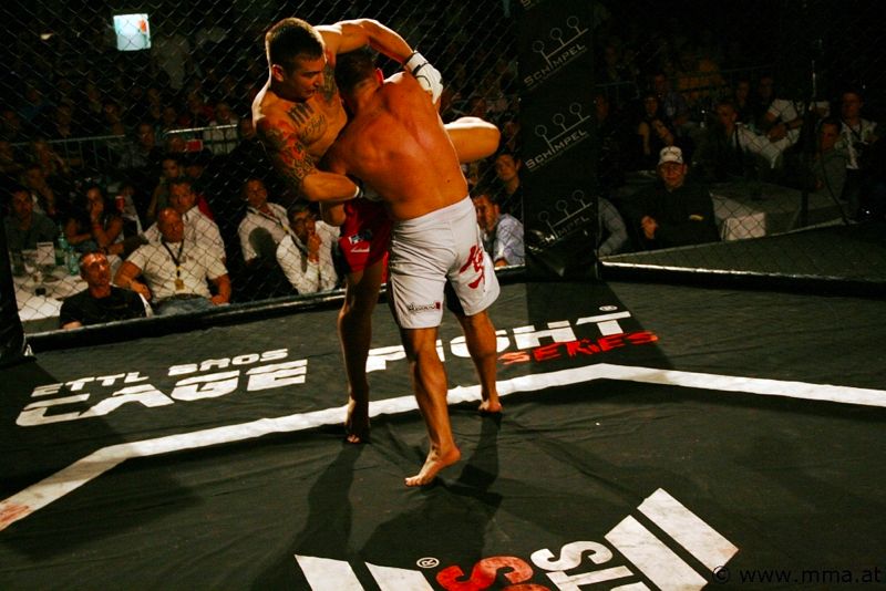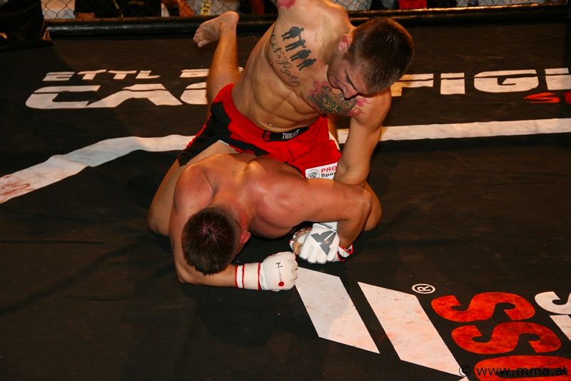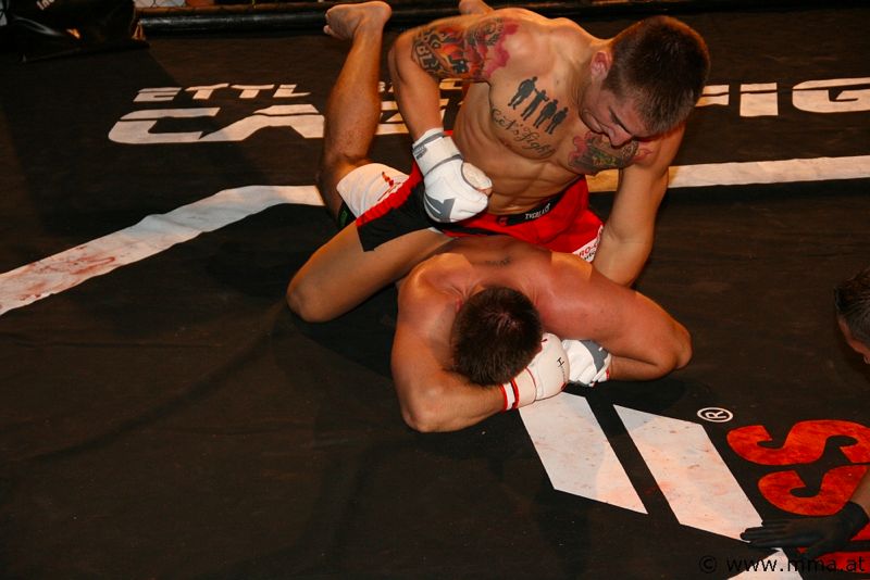 Die Bilanz der Ett Bros Fighter kann sich sehen lassen: 8 Siege, 2 Niederlagen, 1 Unentschieden. Das Main Event des Abends, der Pro MMA Retourkampf zwischen Light Heavyweight Champion Rene Wollinger (9/1) von Ettl Bros. und der ungarischen „Takedown Machine“ Sandor Okros (2/2) von ASZ Team Hungary entwickelte sich zu einer der denkwürdigsten Schlachten an die man sich noch lange erinnern wird. Eineinhalb Runden lang stand das Match auf Messers Schneide. Okros musste viele harte Low Kicks einstecken, trotzdem gelangen ihm immer wieder schnelle Takedowns. Weder am Boden noch am Stand konnte keiner den für sich entscheidenden Vorteil herausarbeiten. Okros geriet beinahe in einen rear naked choke konnte sich aber knapp befreien. Zahlreiche Armhebel- , Triangel und Chokeversuche auf beiden Seiten blieben erfolglos. In der Mitte der zweiten Runde konnte Okros aus dem Clinch heraus einen wuchtigen Kniestoss zum Kopf von Wollinger anbringen. Das daraus resultierende stark blutende Cut ließ Wollingers Auge komplett zu schwellen. Obwohl er auf dem linken Auge nichts mehr sehen konnte und es seiner Ecke nicht gelang die starke Blutung zu stoppen, kämpfte Wollinger trotzdem weiter. Wie ein Löwe stemmte er sich gegen die drohende Niederlage und begeisterte das Publikum mit unbändigem Kampfgeist in dem er sich einige Male am Boden aus schlechten Positionen befreien und anschließend etliche Hammerfists anbringen konnte. Knapp vor Ende der dritten Runde geriet er jedoch in die Arm Triangle von Okros und musste abklopfen. Somit steht es zwischen den beiden nun 1:1.