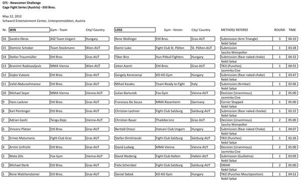 Obwohl Veranstalter Ettl Bros. im Vorfeld der Newcomer Challenge 2 mehrmals darauf hinwiesen hatten dass es sich hierbei um eine kleinere bzw. showtechnisch abgespeckte Version der großen „Cage Fight Series“ handle, waren rund 1.500 Zuseher Vorort. Das schlechte Wetter machte die Durchführung als Open Air Event unmöglich, daher wurde das Geschehen in die anliegende Halle verlegt. Was den Zuschauern von den „Newcomern“ dort geboten wurde entwickelte sich zur großen Überraschung für Alle: unglaublich dramatische Fights bei denen hochmotivierte Kämpfer alles gaben und ans absolute Limit gingen. Spektakuläre K.O.`s , Chokes bis zur Bewusstlosigkeit weil niemand abklopfen will, blitzschnell durchgeführte saubere Techniken, Sportlichkeit und Fairness. All das was MMA so faszinierend und interessant macht wurde den Zuschauern an diesem Abend vor Augen geführt. Man fragte sich ob man nicht im falschen Film sitzt, ob da nicht gerade die Kämpfe der CFS 7 liefen. Zu recht sprechen jetzt schon viele vom bisher besten österreichischen MMA Event des Jahres.